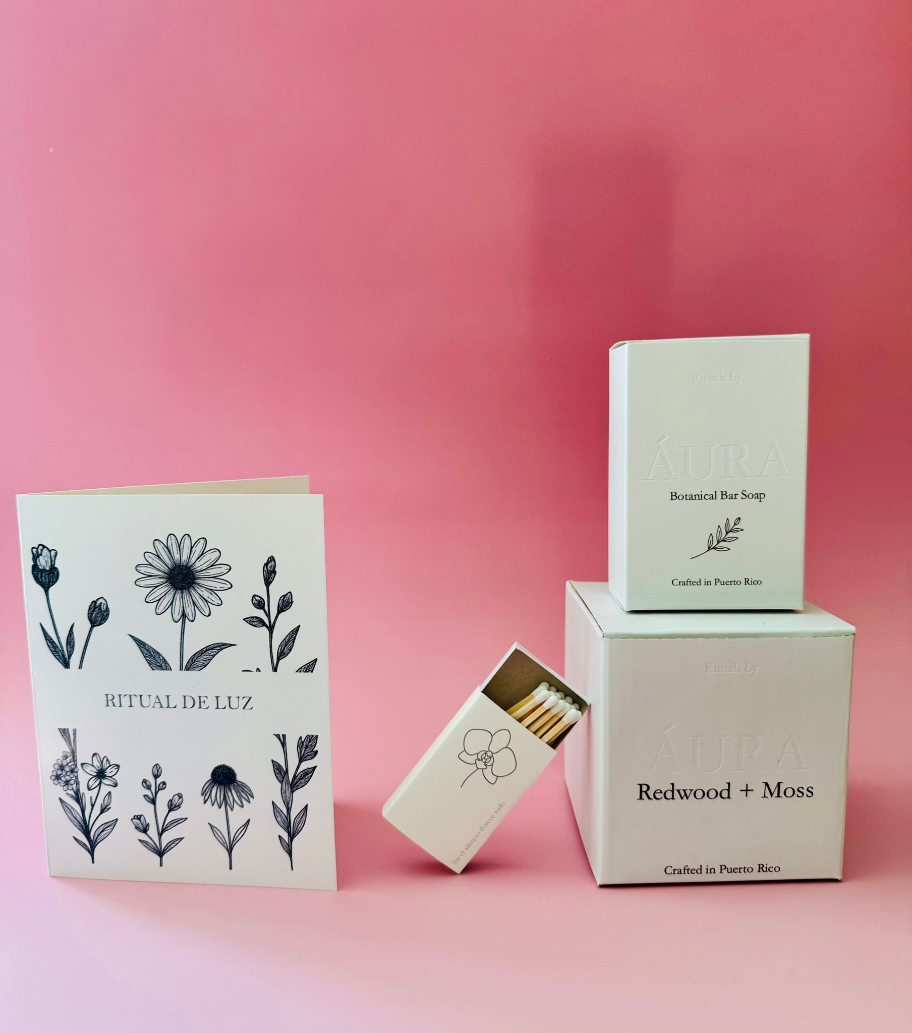 Each box holds 20–25 natural wood matches, printed with the ÁURA line drawing of an orchid and the phrase “En el silencio florece todo.”